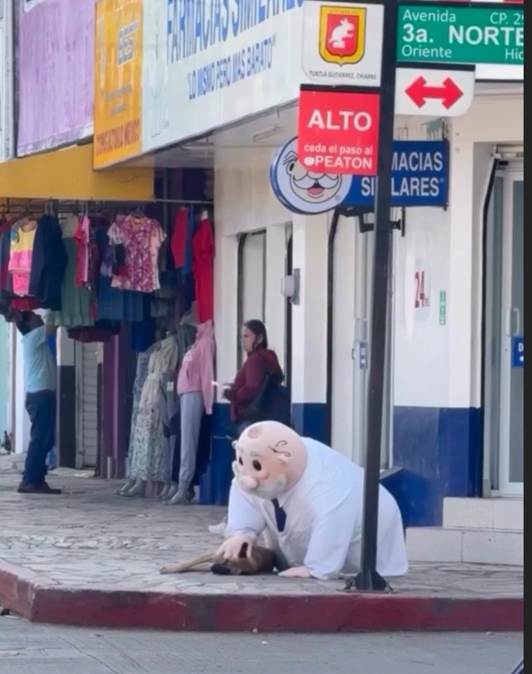 Tuxtla Gutiérrez, Chiapas | 21 de enero de 2026. — Las redes sociales se han rendido ante un video captado en el corazón de la capital chiapaneca. El protagonista es nada menos que la famosa botarga del Doctor Simi, quien fue captado en un momento de genuina ternura con un canino en situación de calle.